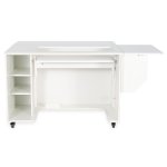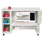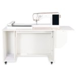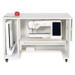 - Expansive work surface with collapsible rear quilt leaf and right-side extension leaf keep your projects from pulling and falling on the floor