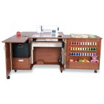 - The hideaway cubby is perfect for sergers or baskets of fabric